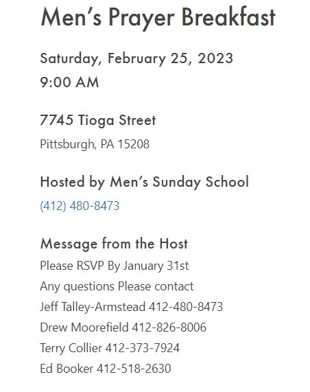 Men’s Fellowship Calendar Add to Calendar Add to Timely Calendar Add to Google Add to Outlook Add to Apple Calendar Add to other calendar Export to XML When: February 25, 2023 @ 9:00 am – 11:00 am 2023-02-25T09:00:00-05:00 2023-02-25T11:00:00-05:00 Where: Bethany Baptist Church 7745 Tioga St